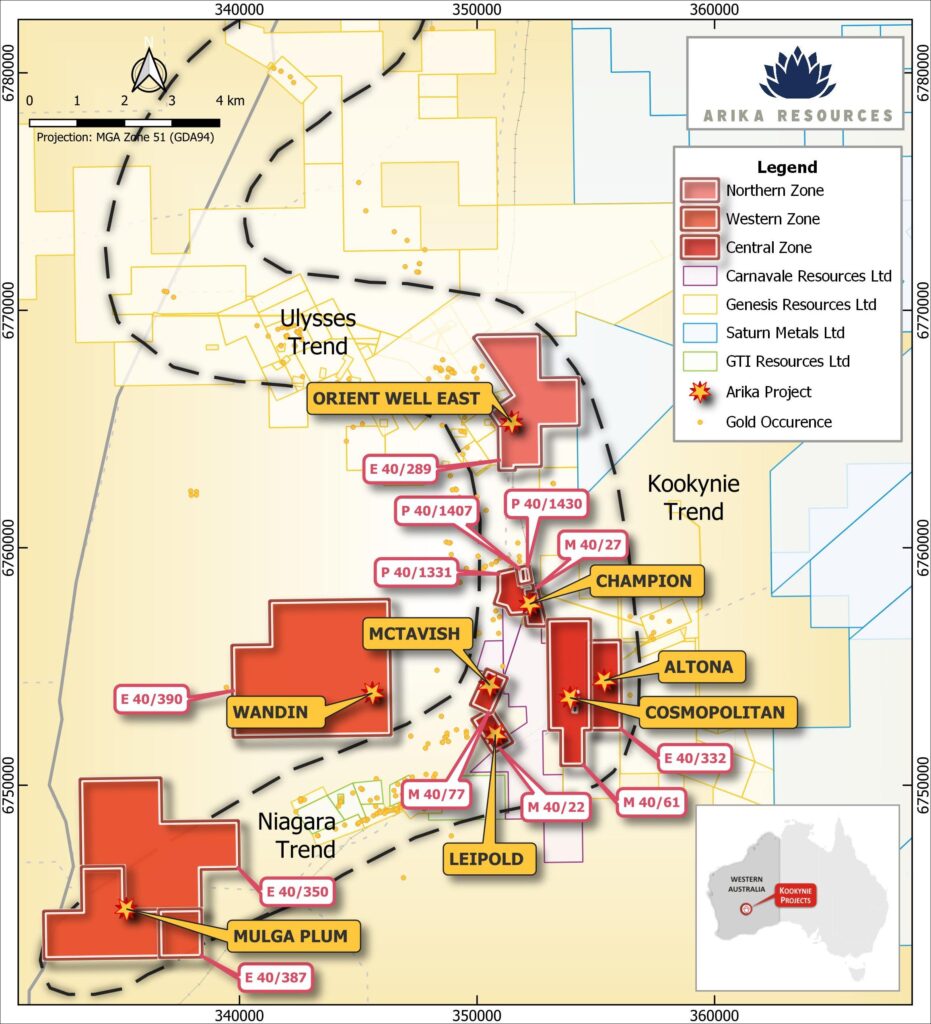 Arika Resources has categorised the Kookynie Gold Project into three distinct zones based on key characteristics as geographic location, mineralisation style and stage of project advancement (Figure 1).