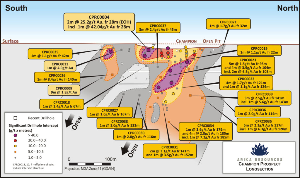The Champion prospect has delivered consistent grades over considerable widths from the most recent assays from drilling which commenced in January 2021, returning significant intercepts in 16 of the 24 holes drilled, including: