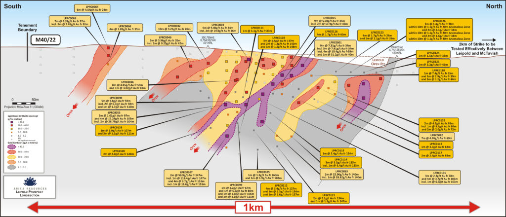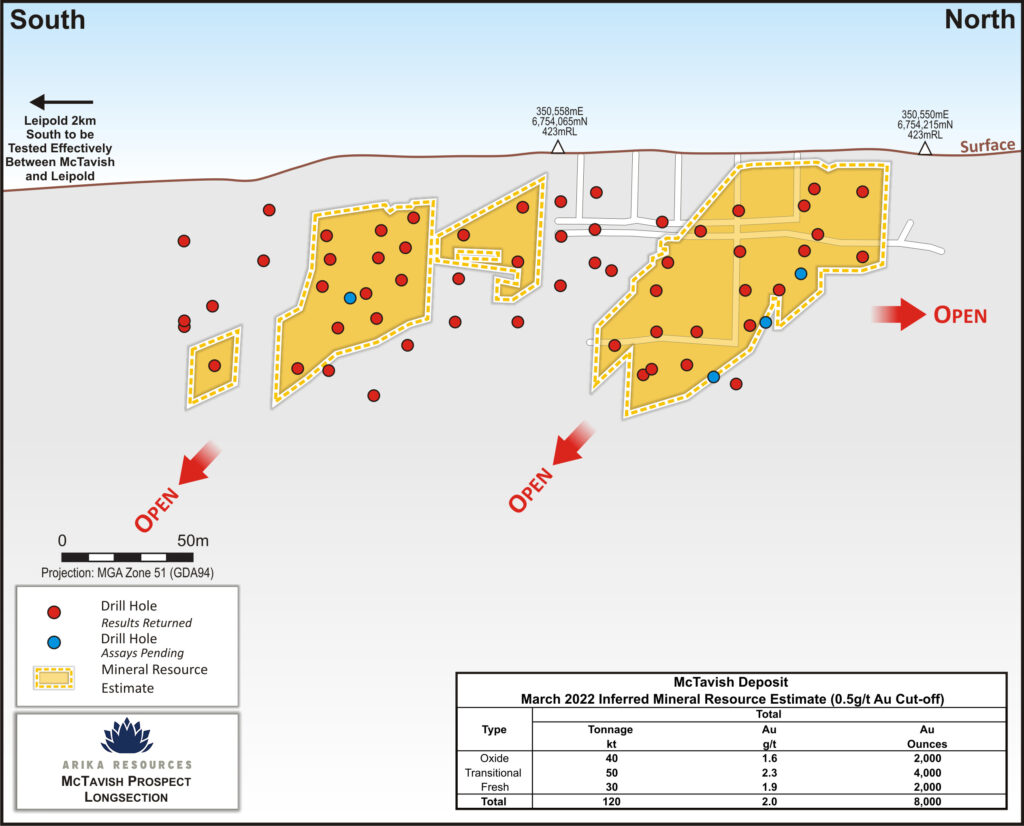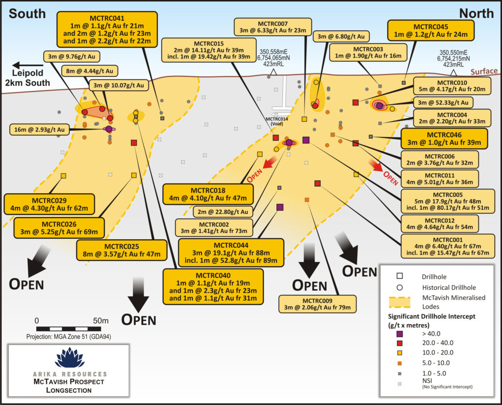 Drilling at the Leipold prospect extended mineralisation a further 200 metres and is now defined over nearly 1km to a vertical depth of only 130 metres, remaining open along strike to the north (towards McTavish) and at depth.