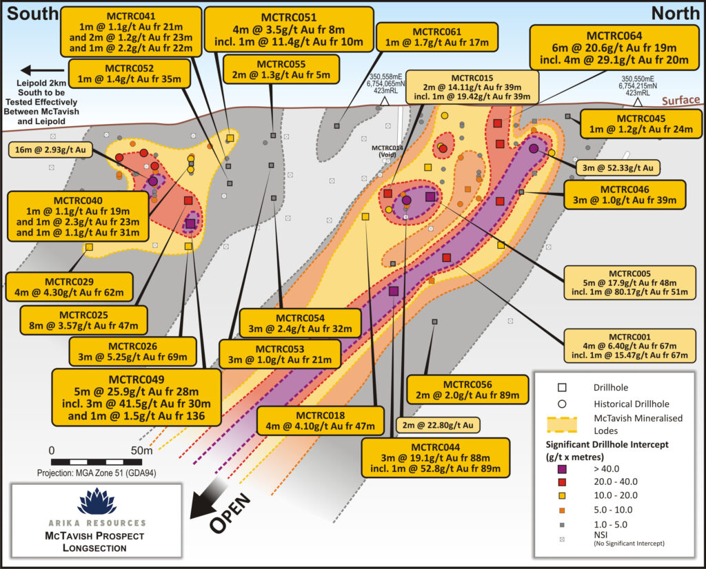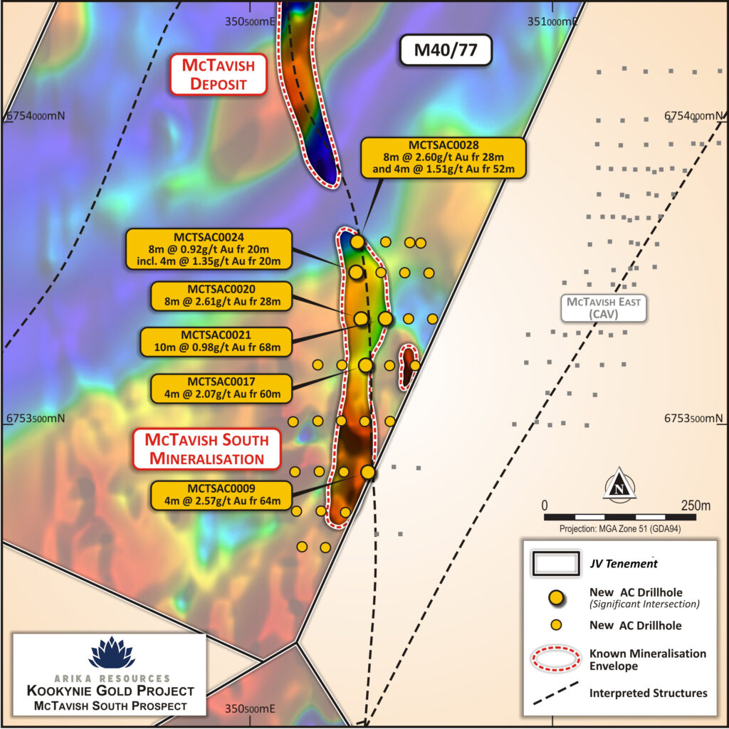 Assay results from drilling by Arika Resources at the McTavish Prospect delivered some of the best high-grade results at the Kookynie Project to date, with spectacular intercepts including: