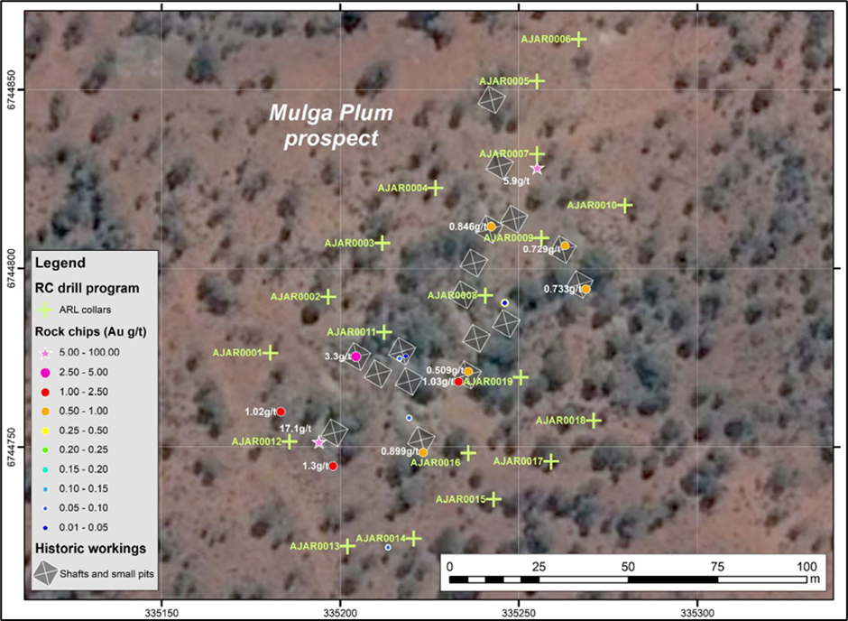 • AJAR0011 – 6 metres @ 1.22 g/t Au from 10 metres.